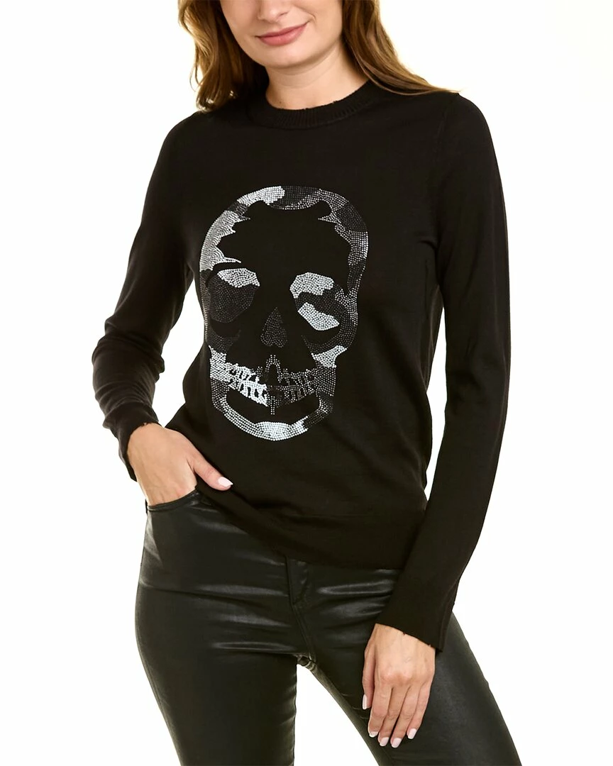 - Camo Skull Wool Top in noir with strass crystal-embellished front and distressed ribbed trim