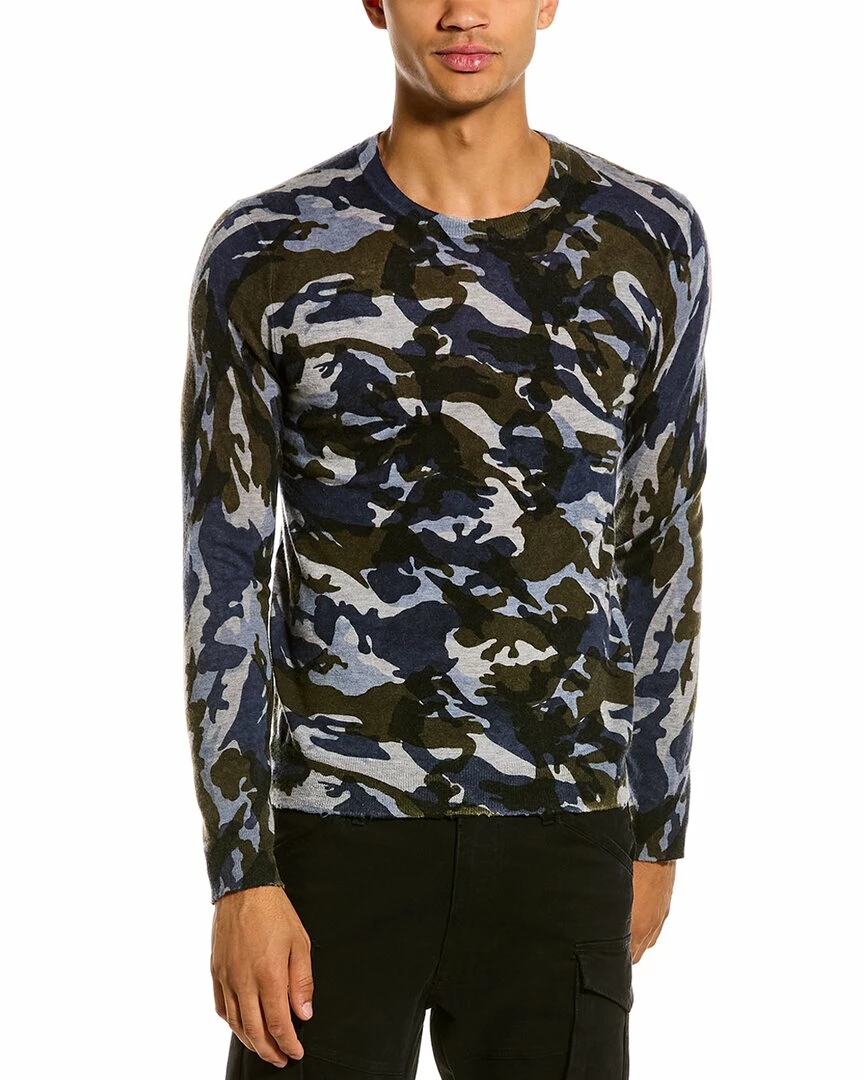 - Kennedy Cashmere Crewneck Sweater in blue and grey camo with distressed rib trim