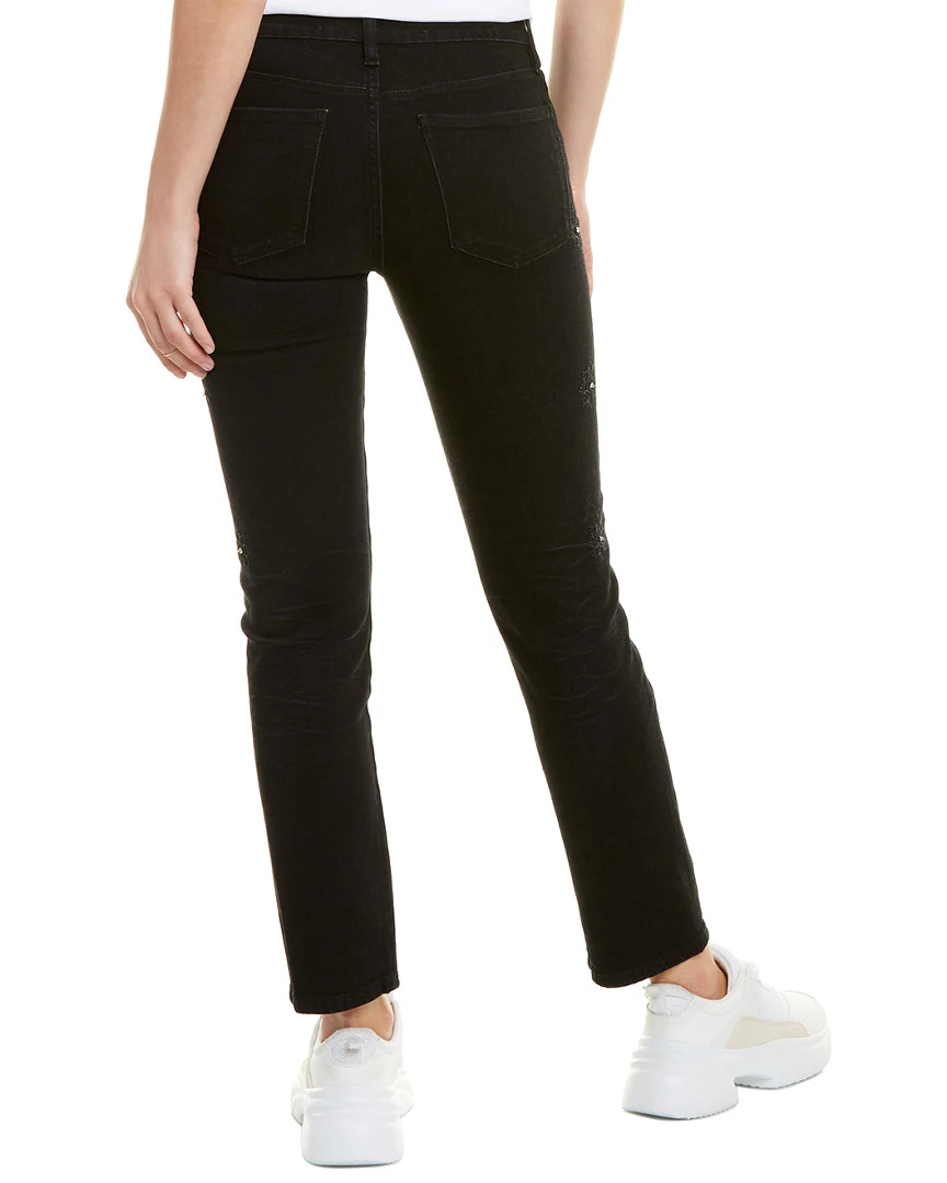 - Design details: embroidered and beaded accents, classic five-pocket style, belt loops