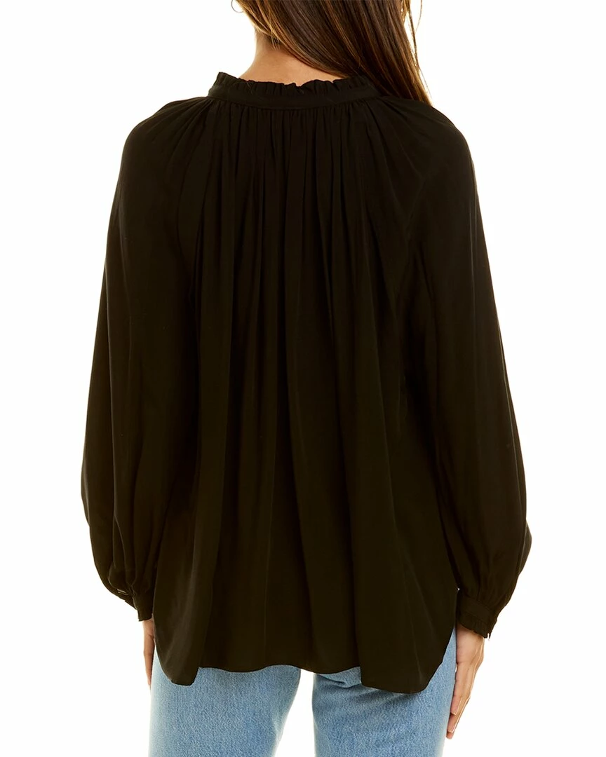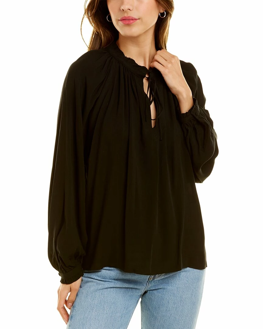 - Theresa Top in black with keyhole neck with self-tie closure and ruffle trim