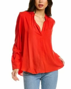 - Tink Top in red with split neckline, shirring details and barrel cuffs