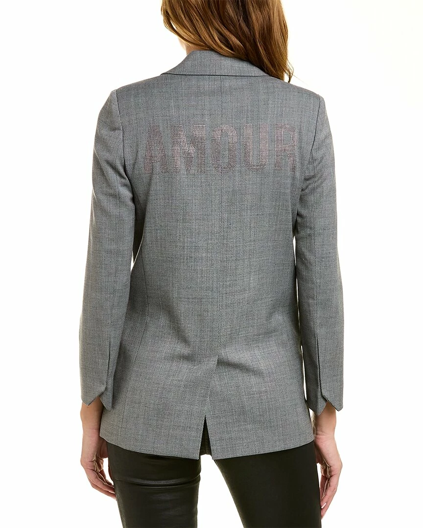 - Viva Amour Strass Wool-Blend Blazer in anthracite with peak lapel, dual front pockets, vented cuffs, strass crystal-embellished back, and vented back hem